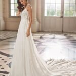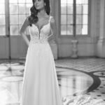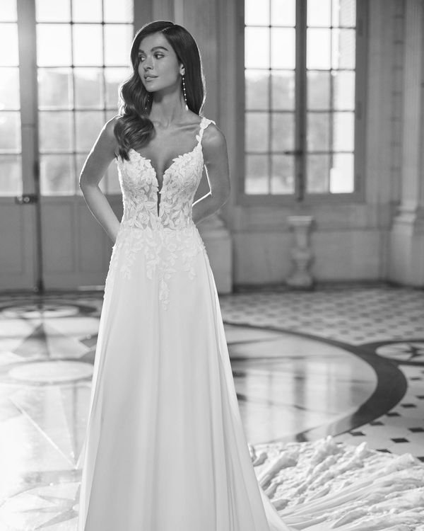 Robe de mariée longue, de coupe droite et style romantique, confectionnée en georgette et en dentelle. Elle présente un décolleté plongeant, un dos en V et des bretelles. Arborez un élégant modèle Rosa Clará Dreams.