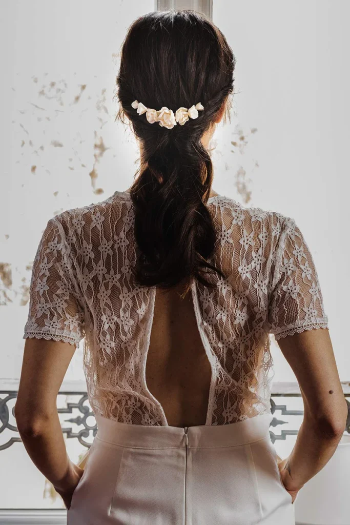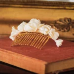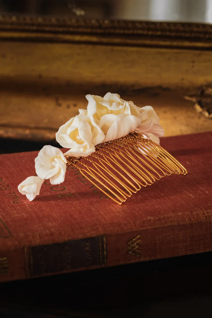 Des matériaux sélectionnés avec soin pour leur beauté et leur résistance, pour un peigne de fleurs qui garde son éclat longtemps après le jour de votre mariage. Contrairement aux fleurs séchées de certains peignes de mariage, qui peuvent perdre leurs pétales au fil du temps, la porcelaine dans laquelle ces fleurs sont façonnées résiste dans le temps.