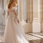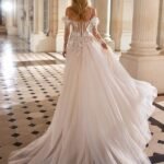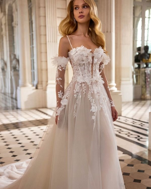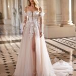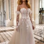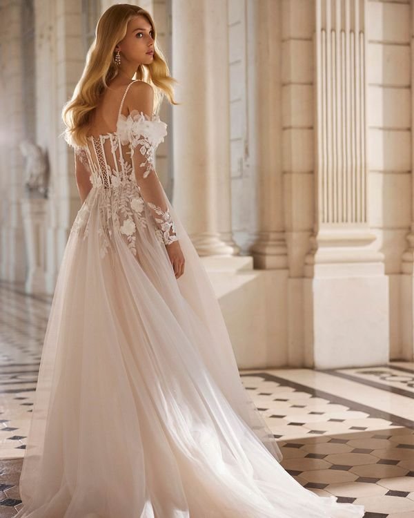 Robe de mariée longue, de coupe droite et au style romantique, élaborée en dentelle et terminée par une jupe en tulle. Elle possède un décolleté plongeant, un corset à manches détachables, une jupe fendue sur le côté et un corsage orné d’une fleur. Un modèle de rêve Rosa Clará Dreams.