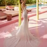 Robe de mariée sirène longue. Perles, décolleté en cœur, dos à bretelles croisées et fente sur le devant. Veste non incluse.