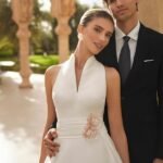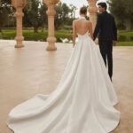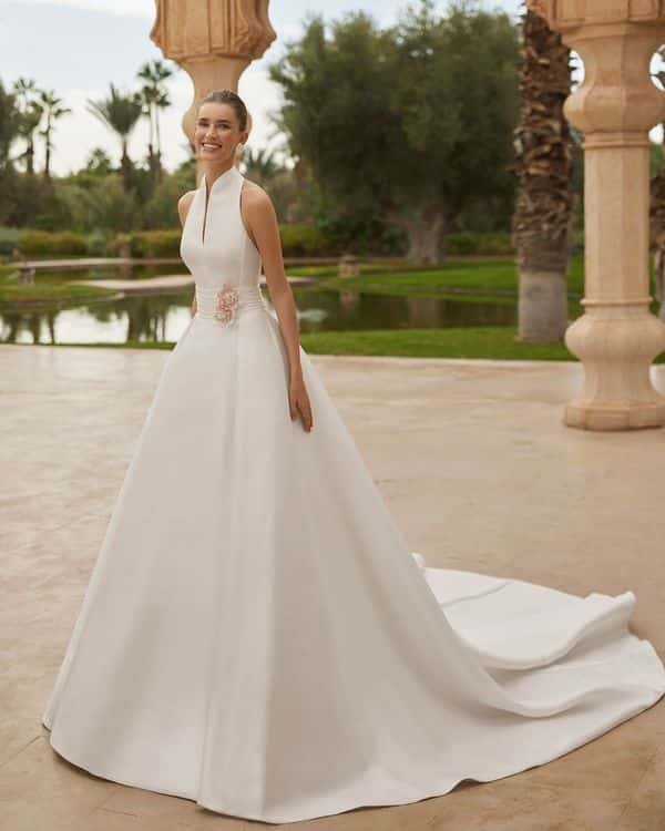 Robe de mariée longue et volumineuse. Confectionnée en tissu sienne, elle présente un col halter, un dos nu et des détails floraux.
