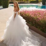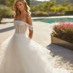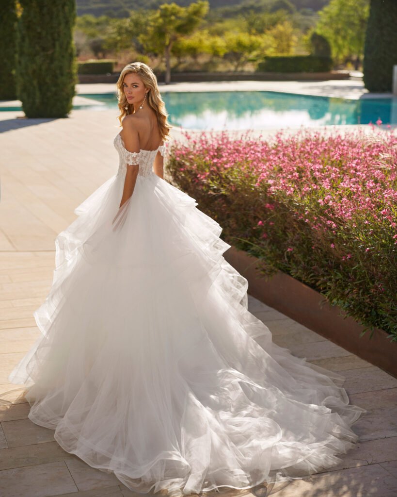 Robe de mariée longue et volumineuse en tulle, avec un haut en dentelle et perles, un décolleté bustier et des bretelles amovibles.