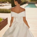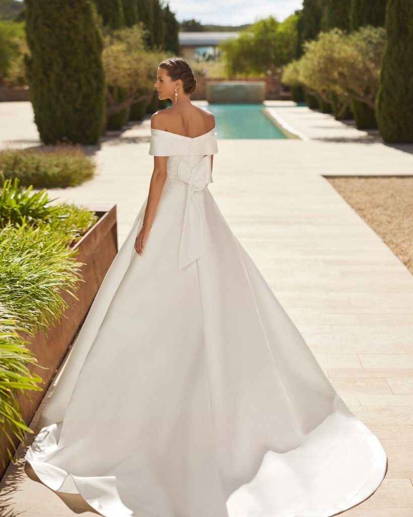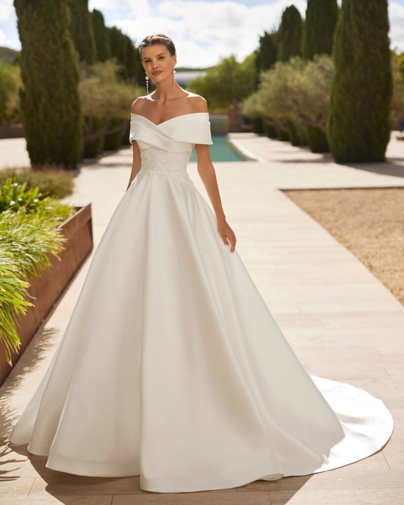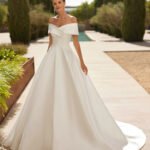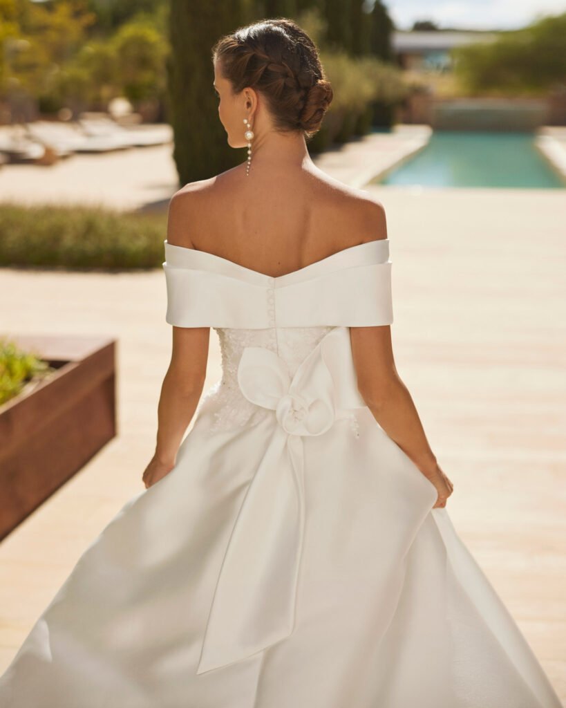 Robe de mariée longue de coupe A en mikado, avec un décolleté croisé et une jupe munie de poches.