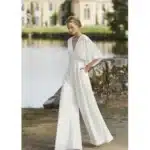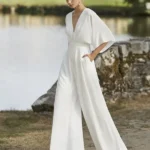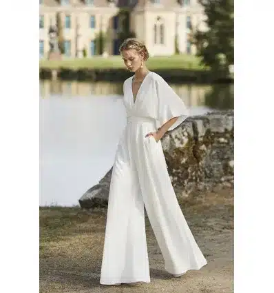 Cette Combinaison de mariée en crêpe légère ceinturée à la taille avec des manches ¾ chauve-souris et un décolleté en V face et dos est parfaite pour les mariée contemporaines qui veulent mettre en valeur leur taille tout en restant à l’aise.