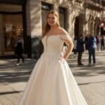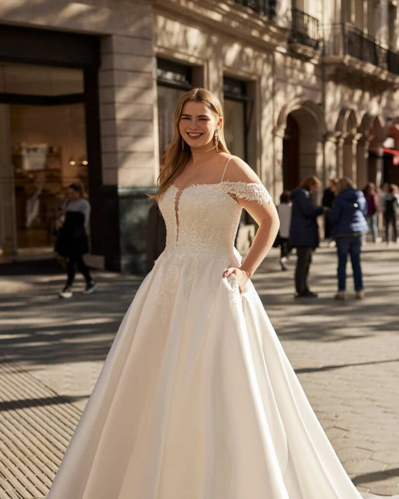 Robe de mariée volumineuse. Corsage en detelle et strass. Décolleté profond, doubles bretelles et dos échancré.