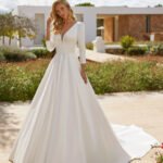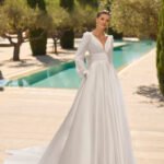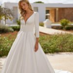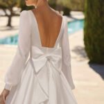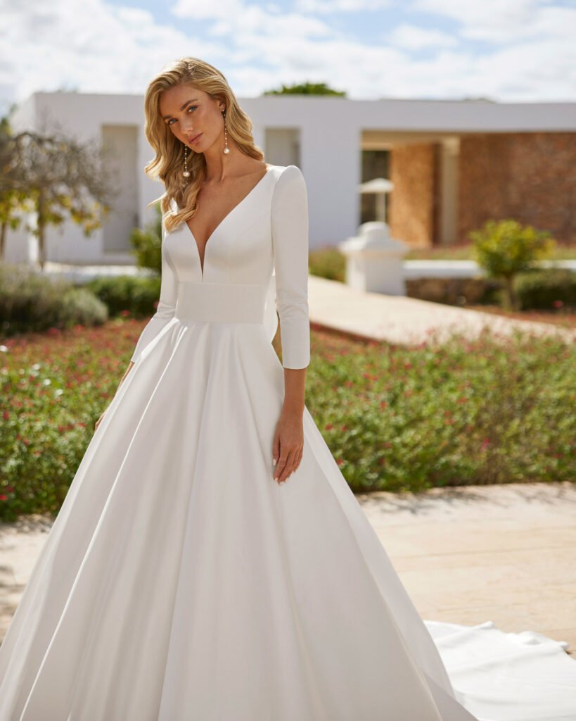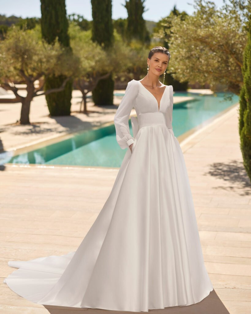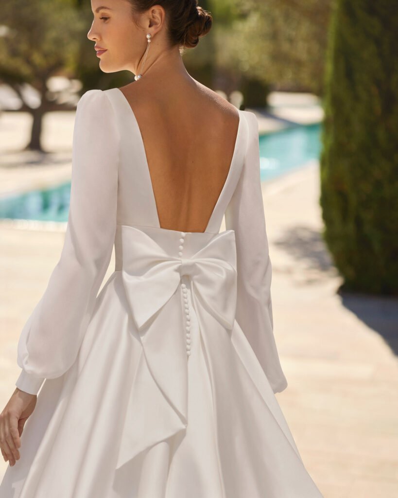 Robe de mariée style classique en satin. Décolleté plongeant et dos en U avec nœud et poches.
